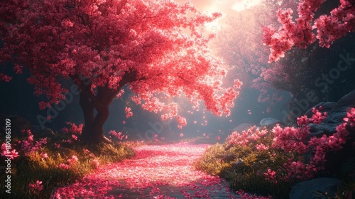blossom, pink, tree, nature, flower petals, blooming, scenic, landscape, floral, vibrant, beauty, spring, garden, serene, outdoors, fantasy, romantic, dreamy, pathway, flower, natural, lush, soft, sunlight, cherry, seasonal, colourful, foliage, tranquil, magical, peaceful, park, aesthetic, artistic, greenery