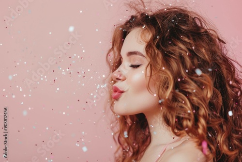blow, air, beautiful, brown-haired, celebrate, christmas, colours, confetti, curly, decorative, happiness, send, young, smile, pastel, spring, stylish, new, dress, holiday, wear, face, pink, profile, season, fashion, element, party, side, wavy, spangled, glamour, dreamy, girl, happy, trendy, joy, year, fun, dream, student, dotted, hair, woman, kiss, lip, merry