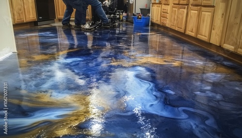 Blue and Gold Metallic Epoxy Floor Installation in Progress A Modern and Stylish Flooring Solution