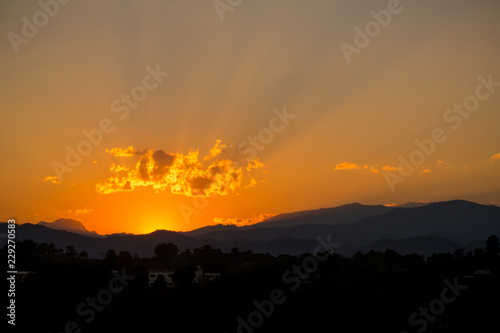 Blue and orange sunset sky with rays of sun. Natural landscape for background. soft and blur style for background.In New Year 2019.Sun rise, sunlight, sunbeam, sunshine, Naturally beautiful.