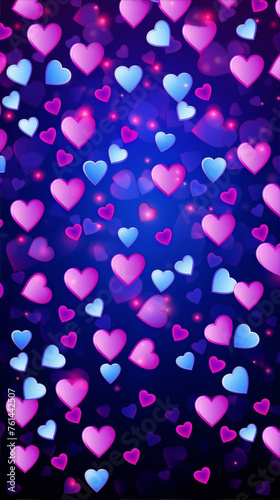 Blue and pink hearts of various sizes on a dark blue background with a gradient.