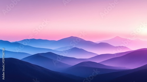 mountain, sunset, landscape, nature, sky, blue, pink, purple, dusk, scenic, horizon, vale, mist, gradient, light, tranquil, serene, calm, peaceful, layer, depth, distance, far, rolling, hill, range, view, panorama, outdoors, scenery, background, graphic, minimal, soft, dreamy, pastel, colours, twilight, dawn, morning, evening, atmosphere, aethereal, beautiful, stillness, calmness, vista, abstract, illustration