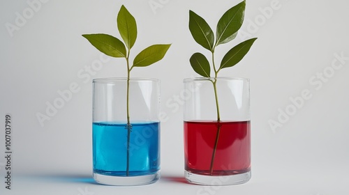 Blue and red liquids in a laboratory setting, representing sustainable plant development and growth. Biotechnology