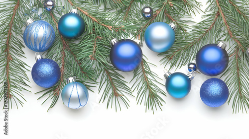 Blue and Silver Christmas Ornaments Decorate Pine Branches Festively on a White Background