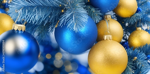 Blue and yellow Xmas balls. AI generated illustration
