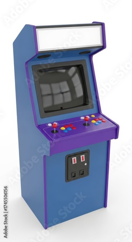 Blue arcade cabinet with purple trim isolated on a white background, retro arcade game