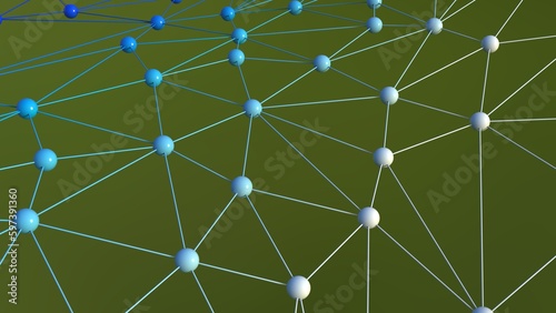 Blue atom structure on green background. Concept of biological science, network technology and human strategy. 3D CG. 3D high quality rendering. 3D illustration.
