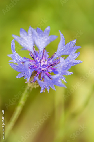 Blue bachelor button flowers with dew drops - cornflower, centaurea cyanus - in the wild, on a sunny day