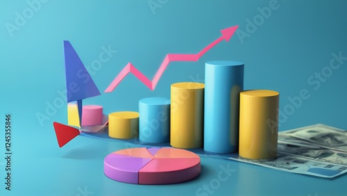 Blue Background with Bar Graph, Pie Chart, and Dollar Bills Financial Data and Statistics Concept with Colorful Bars.