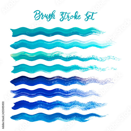 Blue brush stroke waves vector set. Hand drawn vector brush strokes, ink splashes, watercolor brush, hand painted curls. Summer design paint brush curves.