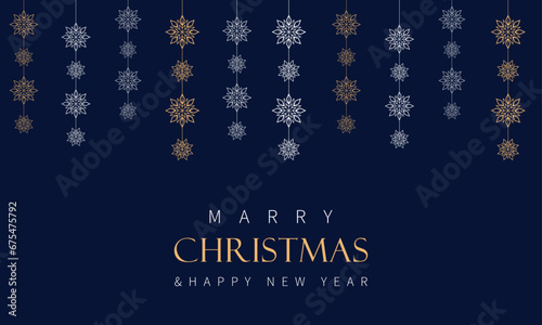 Blue christmas card with white and gold snowflakes, marry christmas and happy new year