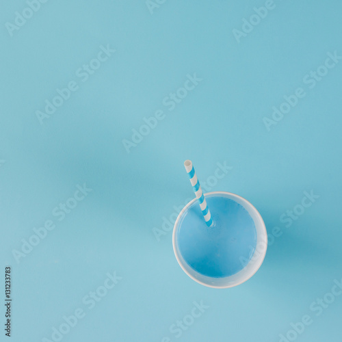 Blue drink with straw. Flat lay minimal concept.