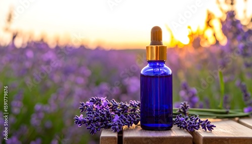 lavandula, sunset, bottle, dropper, blue, gold, serum, oil, essential, floral, natural, organic, beauty, skincare, health, wellness, sunrise, field, nature, summer, purple, flower, plant, wooden, table, product, glasses, liquid, light, sharpened, detail, close, up, healthy, fragrant, therapeutic, gold