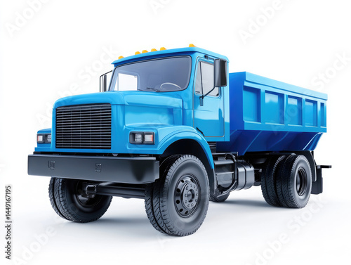 Blue dump truck, front view, isolated on white background. Modern, commercial, heavy-duty vehicle. Solid color, ideal for transportation
