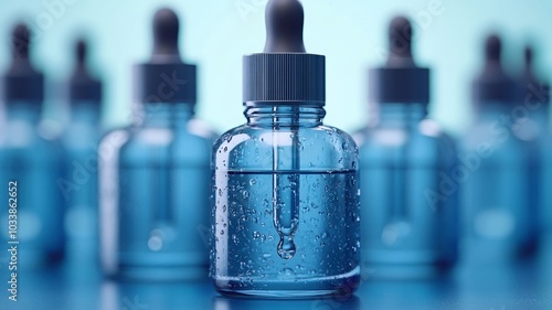 Blue glass dropper bottles with liquid and reflections