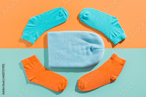 vogue, hat, sock, colours, aesthetic, trend, wear, apparel, authentic, minimal, fashionable, layout, pastel, trendy, colourful, soft, stylish, textile, warm, clothes, composition, idea, garment, foot, fabric, pair, cotton, overhead, clothing, sock, new, arrangement, set, clean, orange, blue, topview, design, fashion, pattern, creative, glacé, colours, green, teal, background, cleaving
