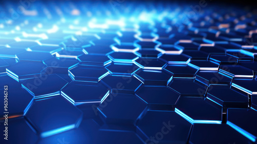 Blue hexagon background. Hexagonal structure, honeycomb pattern, metallic. Illuminated outlines. Depth and three-dimensionality. Modern, geometric, futuristic and technological design.