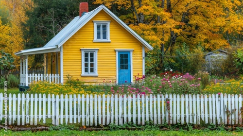 blue, house, white, picket fence, suburban, neighbourhood, window, front yard, home, residence, property, exterior, architecture, residential, american dream, traditional, wooden fence, facades, family, housing, quaint, real estate, cosy, comfort, residential area, bourgeoisie, domestic