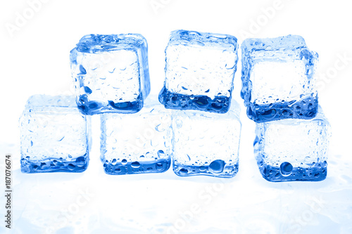 Blue ice cubes on white background.