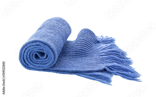 Blue knitted scarf isolated on white.