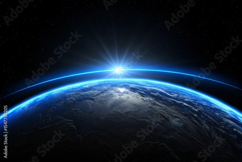 Blue Light Rising from Planet Horizon, Glowing Shine Background. Bright star light shine from the edge of a planet.