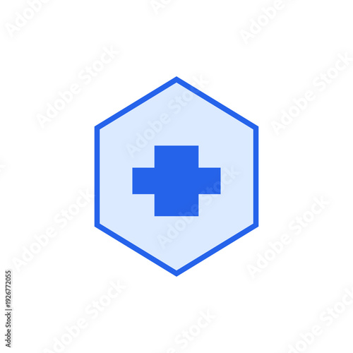 Blue medical cross symbol on hexagon shield icon