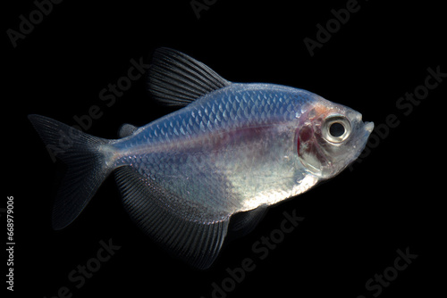 Blue neon glow fish on black background.Abstract of red glow fish, glow fish on black background