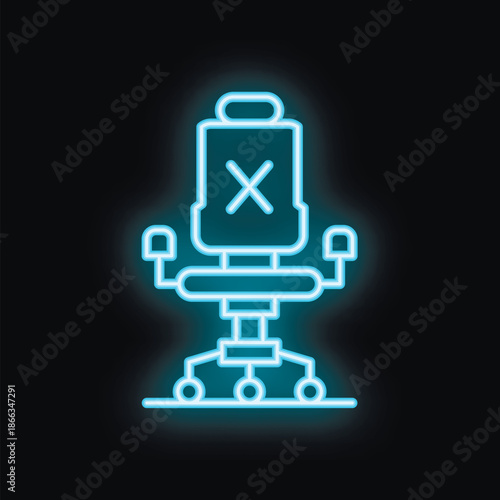 Blue neon sign of an office chair glowing on a black background