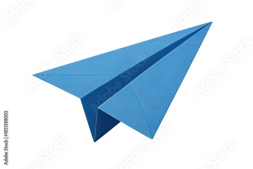 Blue paper airplane flying, representing communication, innovative ideas, freedom, travel, sending messages, and childhood play