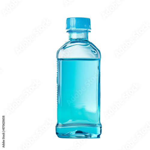 Blue plastic bottle filled with liquid, standing upright. Isolated on transparent background, perfect for product, healthcare, or hydration concept.