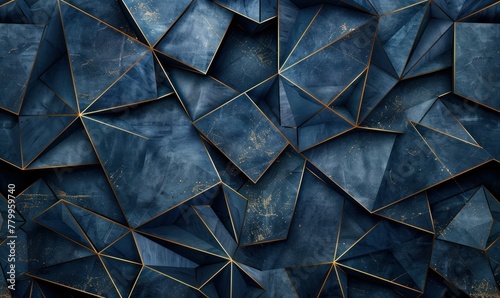 Blue polygonal textured background with golden lines. Geometric abstract background with 3d effect.
