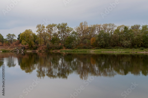 Blue river slow flowing across the green meadow and yellow sand with reflections of trees in the water. Fall