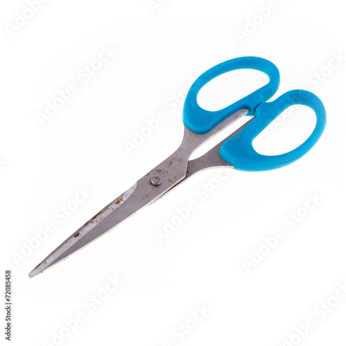 scissors, equipment, accessory, tool, background, blade, blue, clipper, cut, handle, iron, isolated, metal, object, old, pair, paper, plastic, rust, sharp, single, stainless, stationery, steel, white