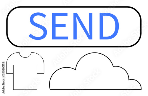 Blue send button paired with a minimalist cloud and shirt outline. Ideal for file sharing, data transfer, cloud storage, textile commerce, digital organization, communication tools, flat simple