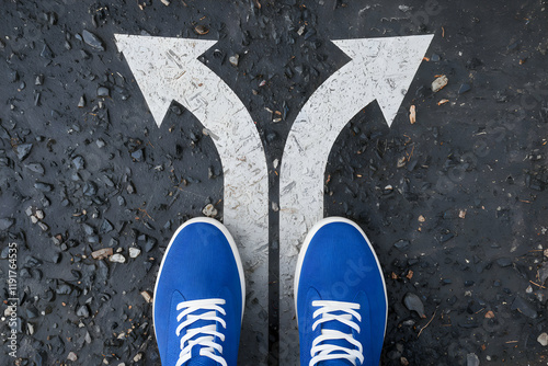 Blue shoes on asphalt with white arrows, symbolizing choice and direction