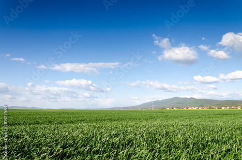 field, sky, grass, green, landscape, meadow, nature, blue, summer, cloud, agriculture, spring, cloud, horizon, rural, land, farm, countryside, lawn, sun, country, wheat, hill, scene, beautiful