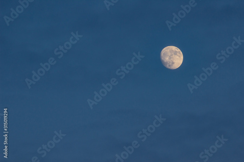 Blue sky with clouds and a round full moon. A beautiful night sky. Moonlight evening light.