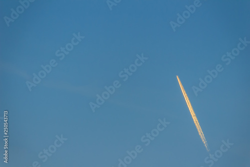 Blue sky with smoke contrail from a rocket or airplane. White cloud trail of condensed water from an aircraft or rocket at high altitude, seen as a white streak against the empty blue sky.
