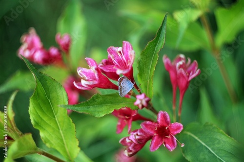 Blue small butterfly among pink flowers