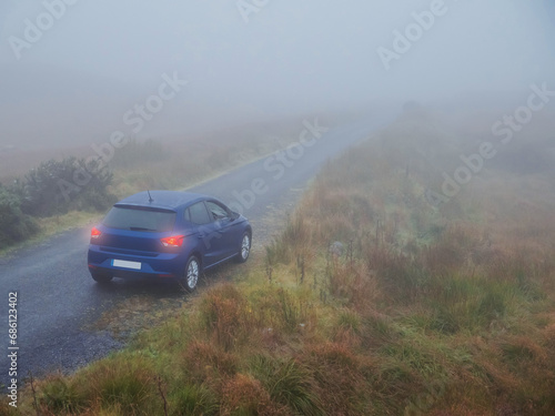 Blue small car parked on a small narrow country road during fog. Dangerous driving conditions due to poor visibility. Nature scene. Selective focus. Travel and tourism.