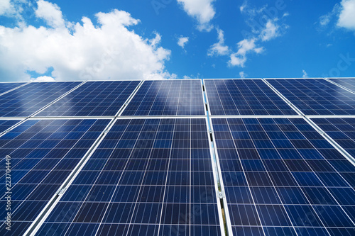 Blue solar panels over blue sky. Renewable energy.