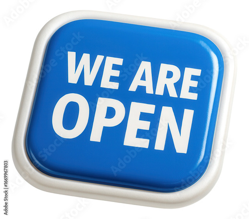 Blue square sticker with WE ARE OPEN message in bold lettering, essential retail promotion on transparent background.