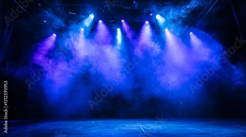 Blue Stage Lighting Eight Spotlights, Smoke, Dark Background, Concert, Event, Performance Stage Lighting, Concert Photography