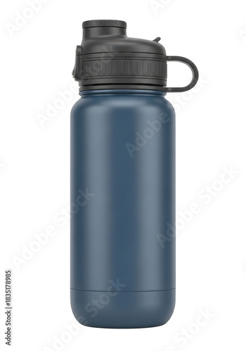 Blue stainless steel water bottle with black lid, reusable container for drinks, hydration equipment, isolated on transparent background
