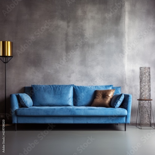 Blue stylish sofa near grunge concrete wall. Loft interior design of modern living room