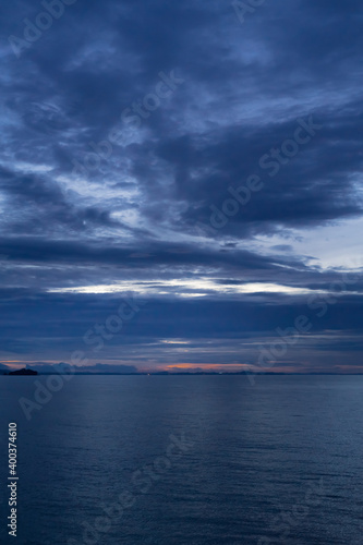 blue sunset sky oversea. intense colours. Twilight landscape. Sun at dusk. The image contains soft focus, noise and grain.