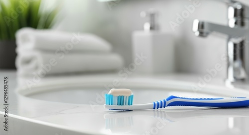 toothbrush, toothpaste, bathroom, sink, hygiene, blue, white, faucet, towel, bristle, clean, dental, morning, washroom, fresh, health, tile, countertop, interior, simple, minimalism, washing, dental care, home, accessory, sanitary, plastic, brush, object, cleanliness, grooming, white background, house