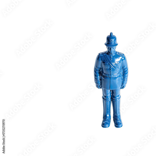 toy, soldier, blue, plastic, figure, hat, helmet, uniform, standing, isolated, black, background, dark, studio, shot, light, shadow, detail, closeup, miniature, small, tiny, person, authority, guard, protection, security, law, enforcement, officer, traditional, formal, attire, vintage, collectable, retro, glossy, smooth, shiny, single, object, subject, nobody, blank, space, alone, silent, stoic, watchful