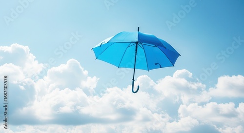 Blue umbrella floating in the sky with clouds