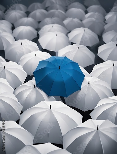 Blue umbrella standing out among a crowd of identical white umbrellas, symbolizing individuality, uniqueness, and creative leadership in a uniform environment